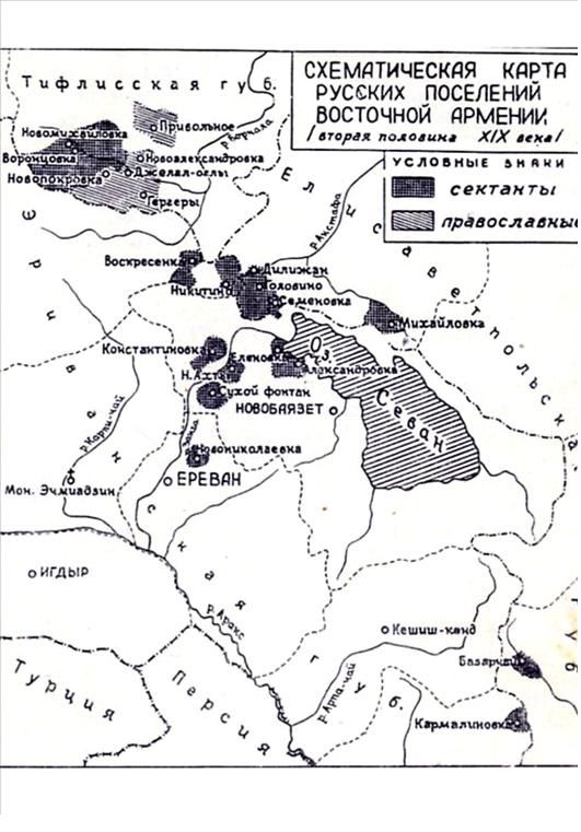 Первоначальным местом поселения русских сектантов в Закавказье явилась Карабахская провинция, куда ссылались духоборы с Дона и молокане из Тамбовской губернии. С 1833 г. последовало разрешение министра внутренних дел о поселении русских в другие районы Закавказья63. Первое сектантское поселение Закавказья (село Базарчай) было основано в 1832—1833 г. на территории Восточной Армении, в Нахичеванском уезде56.